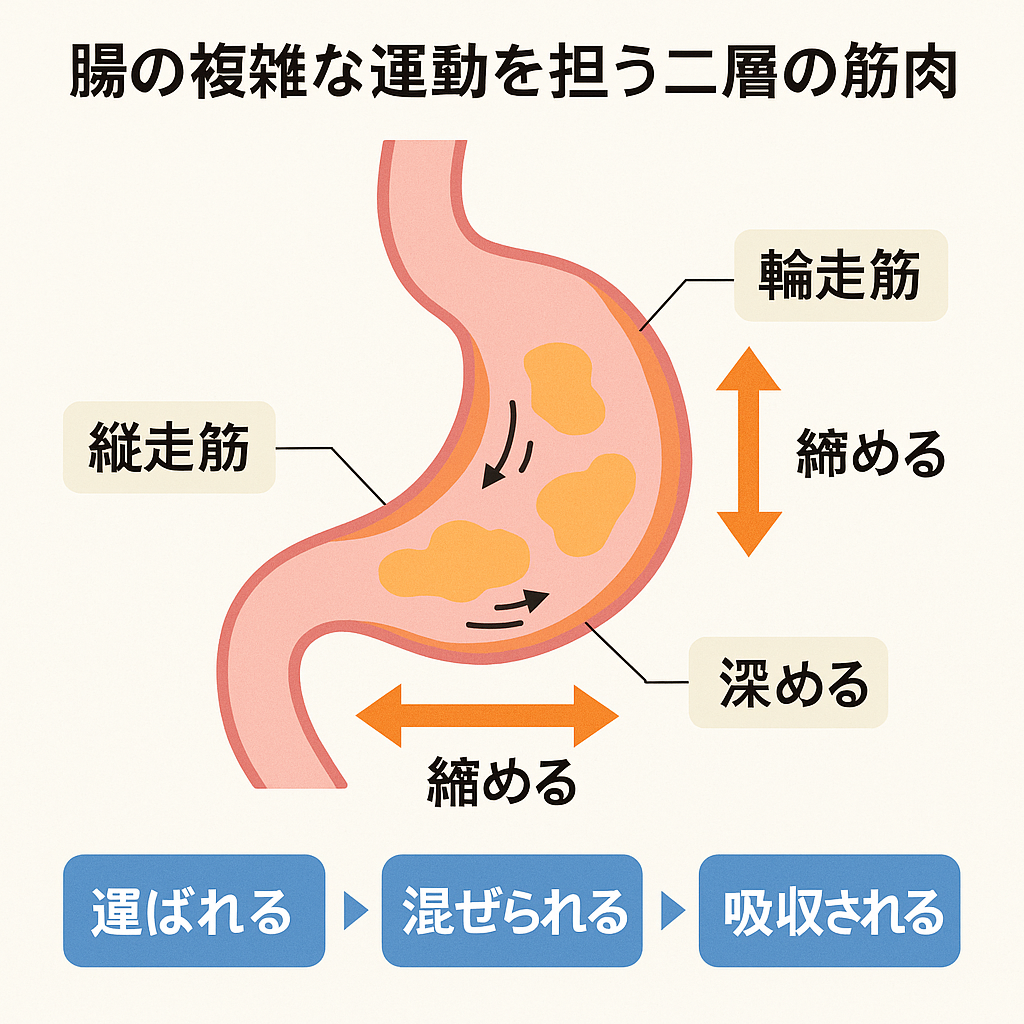 この二つの筋肉がリズミカルに協調することで、食べ物は腸の中をスムーズに移動しながら、